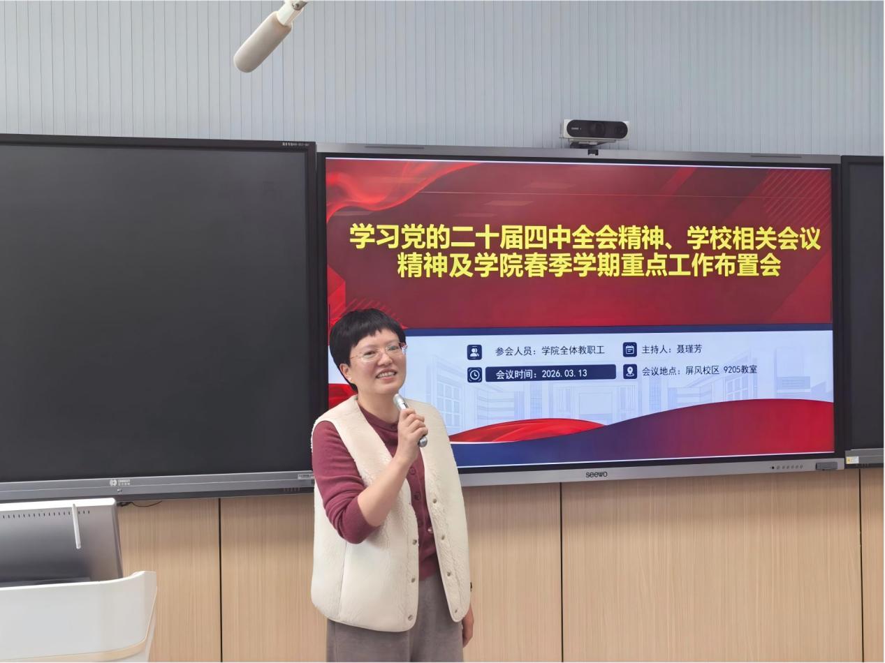 院长聂瑾芳组织学习了党的二十届四中全会精神。她指出,全院上下要将学习贯彻全会精神同落实学校第四次党代会精神紧密结合起来,同学校“十五五”发展的谋篇布局深度衔接,同新学期各项工作的开篇起步一体推进,切实把学习成效转化为强党性、铸忠诚、抓落实、促发展的具体实践。随后,她传达了学校近期召开的春季学期工作会议及相关专题会议精神,强调要紧紧围绕学校确定的年度目标任务,主动担当,积极作为。在部署日本三级
